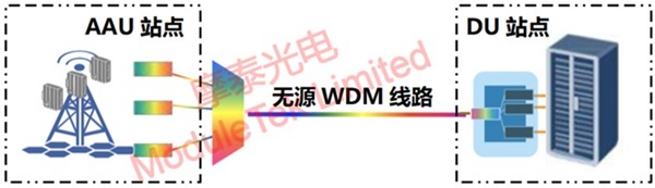 In 5G pre-transmission applications, passive WDM (Wavelength Division Multiplexing) is one of the most common connection solutions. Colored optical modules are installed on AAUs and DUs, and the WDM function is implemented by passive equipment, enabling a single optical fiber to provide connections from multiple AAUs to DUs. Optical signals with different central wavelengths transmitted in the same fiber do not interfere with each other, so colored optical modules realize the synthesis and transmission of multi-wavelength optical signals, greatly reducing link costs.