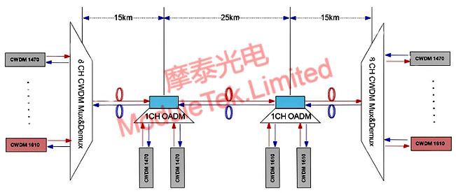 ① After calculation, the total loss of the MUX, OADM (Optical Add-Drop Multiplexer) and fiber is ≤20dB. No optical amplifier is needed for the link, and the CWDM WDM transmission scheme provides a cost-optimized solution.