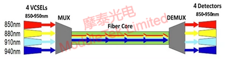 The working principle of SWDM is as follows: Four VCSELs (Vertical-Cavity Surface-Emitting Lasers) at the transmitting end generate optical signals of four different wavelengths, which are multiplexed into a single link via a MUX (multiplexer). At the receiving end, the signals are demultiplexed by a DEMUX (demultiplexer), output as parallel optical signals, and then detected by four detectors and converted into electrical signals.