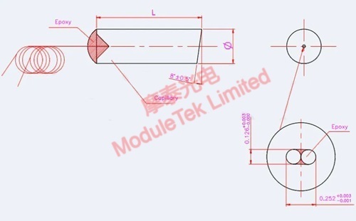 As a light input / output carrier, play a role in protecting the optical fiber, in the oblique 8 ° surface plating permeability enhancement film is more conducive to fiber optic transmission, in the TFF WDM device, one of the optical fiber as the input COM, the other end of the output as Reflect, oblique 8 ° surface and then coupled with the oblique 8 ° surface of the G-Lens, the light from the COM into the light after the other end of the G-Lens perpendicular to the light in the G-Lens. -Lens at the other end of the perpendicular to the optical axis of the surface focus, and ultimately according to the two sides of the film on the coating system of the specific band, reflection and transmission of the two segments of the irrelevant band, in which the reflected wave from the dual-fiber pigtail's output Reflect ejected, Dual fiber Pigtail mechanical dimensions are shown in Figure 4.
