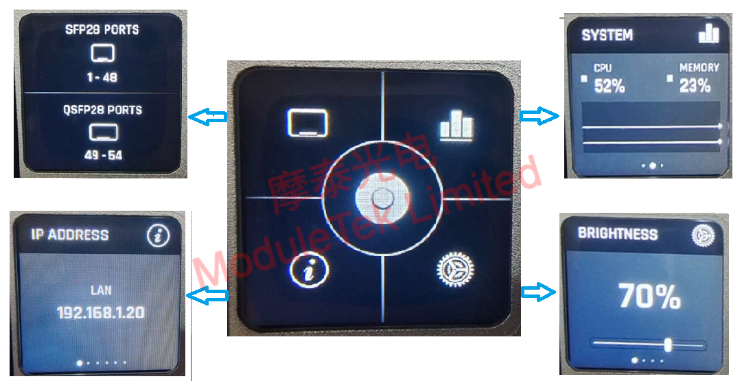 Connect the power cable to power on the device—there is no obvious noise during startup. During boot, the interface LEDs display a visually striking multicolor flowing light effect. After startup, the touchscreen control panel can be used to view device version, IP address, port status, and other information.