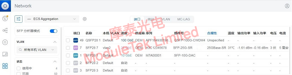 When using 25G SR optical modules of Moduletek connected to the SFP28 port, the module type is correctly identified.