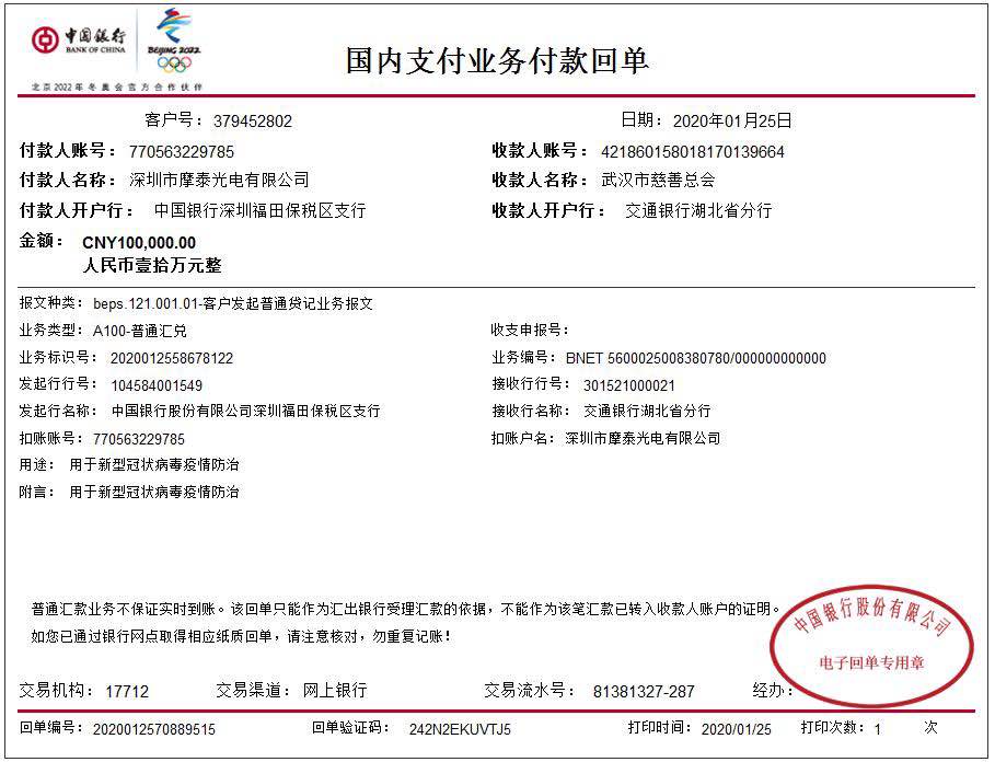After the outbreak, Moduletek Limited donated RMB 100,000 to Wuhan Charity Federation at the first time, specifically for the prevention and treatment of the new coronavirus pneumonia outbreak in Wuhan. A small contribution, a little heart, MOTEK is willing to take practical action into the flood of love with the city of the same respiration, common destiny, to combat the epidemic, and tide over the difficulties together!