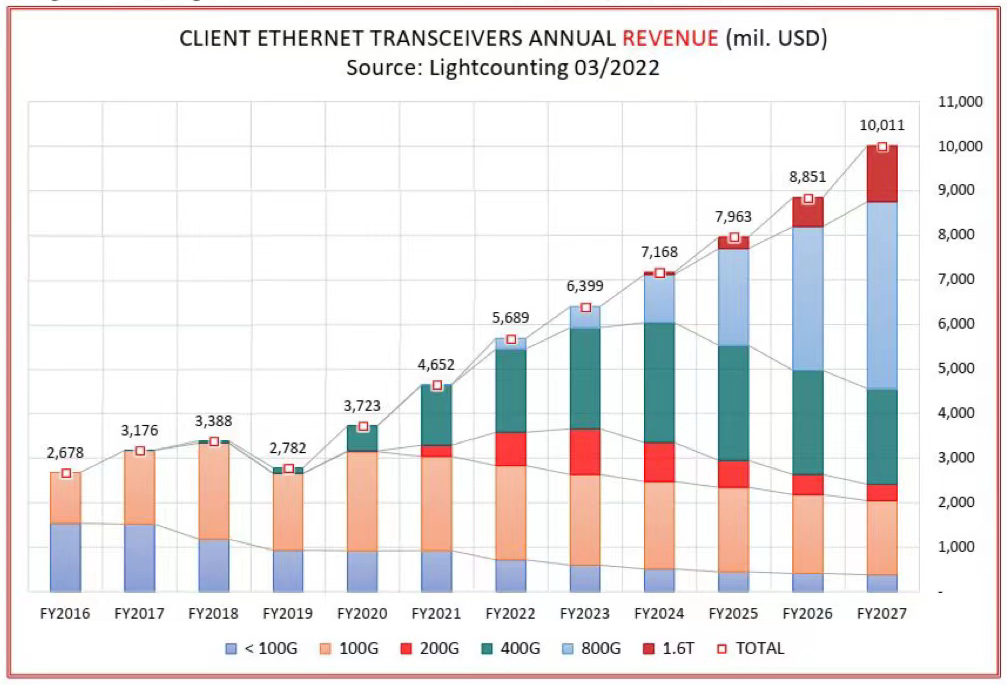 According to market researcher Lightcounting.In 2021, global Ethernet optical module sales hit a new record of $4.6 billion, up 25% from 2020. As shown in the chart below, the market grew 32% in 2020 after declining 18% in 2019.LightCounting expects the market to slow to a CAGR of 14% from 2022 to 2027, but even with this modest growth, the global Ethernet optical module market will still reach $10 billion by 2027. The market will remain volatile, and LC's long-term forecast model is not designed to reflect this volatility, but provides reasonable five-year targets for the industry, as shown in Figure 1.